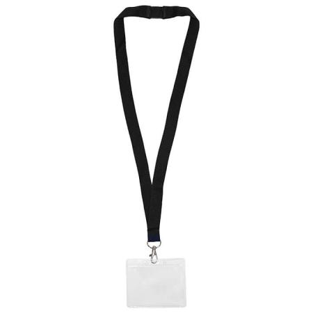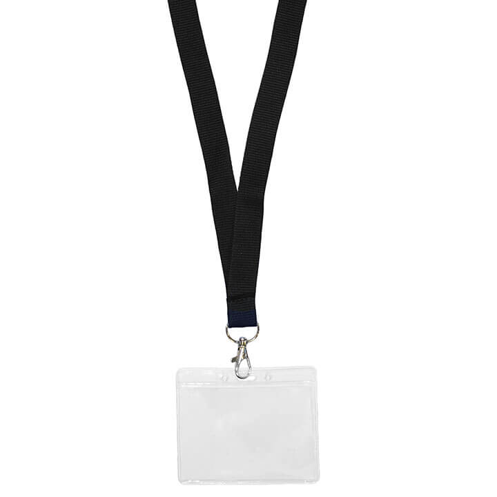 Zwarte keycord / lanyard met een metalen musketonhaak en in de nek een kunststof veiligheidssluiting. Aan de musketonhaak zit een doorzichtige kunststof pashouder. De pashouder is van flexibel plastic, als u zelf een pasje in de pashouder wilt doen kunt u het beste de afmeting 9 x 6.5 cm aanouden. De keycord is 2 cm breed.