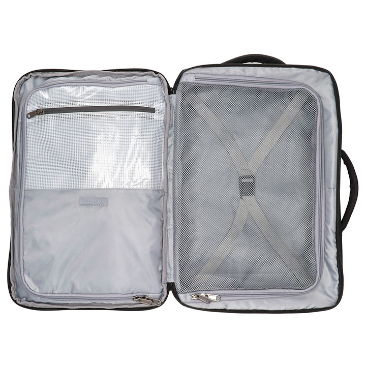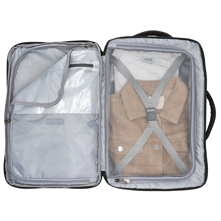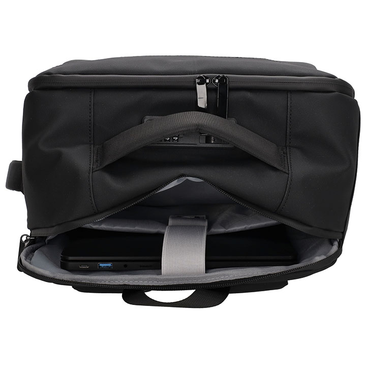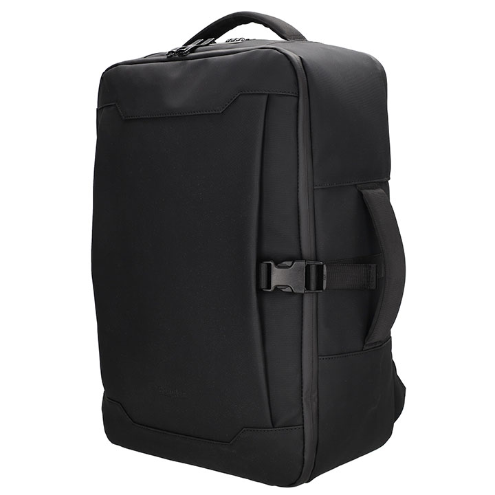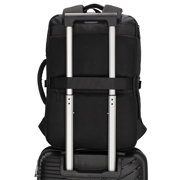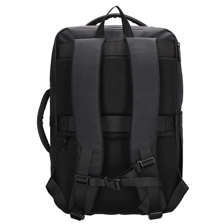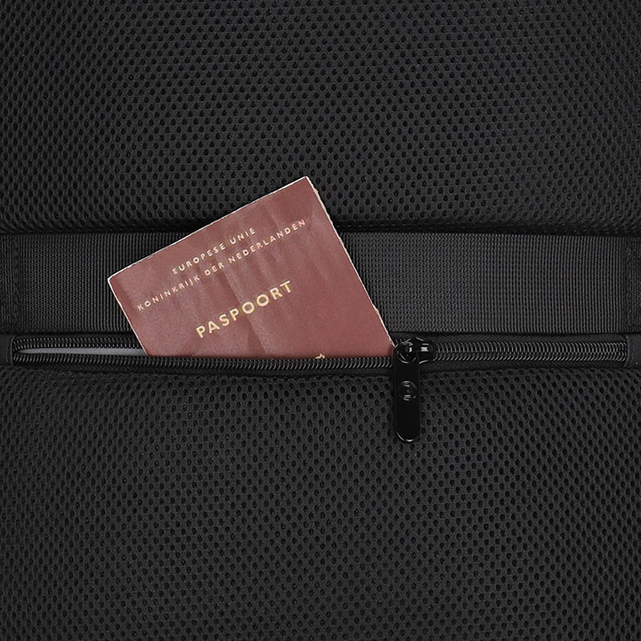 De tas kunt u dragen met 1 van de 2 handvatten of met de verstelbare schouderbanden. De rug en schouderbanden zijn gewatteerd, hierdoor draagt de tas zeer comfortabel. Op de achterzijde heeft de rugzak een hidden vak met ritssluiting en een smart-sleeve, met de smart-sleeve kan de rugzak gemakkelijk bevestigd worden aan de trekstang van een trolley. De afmeting van de tas is 32 x 45 x 16 cm.