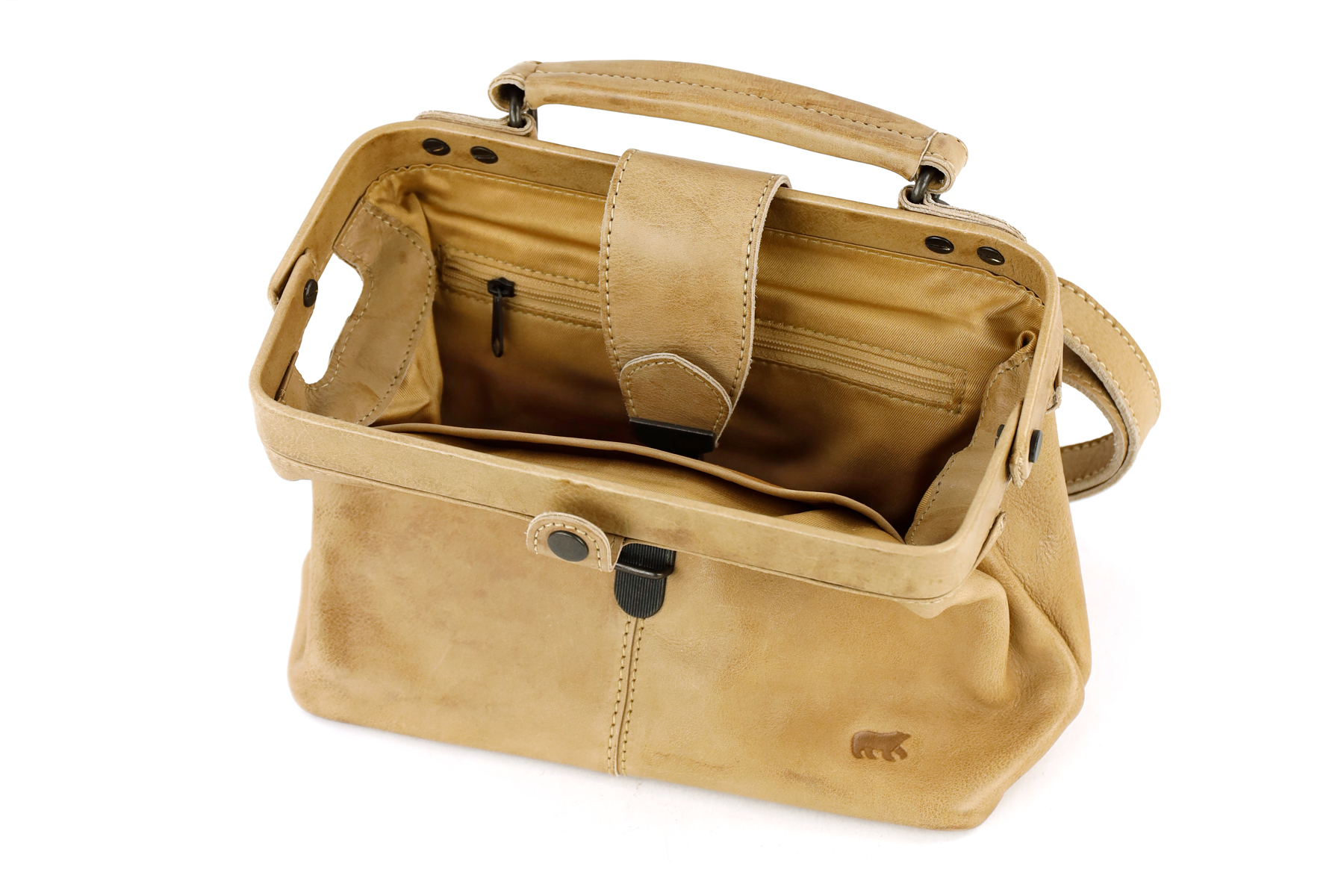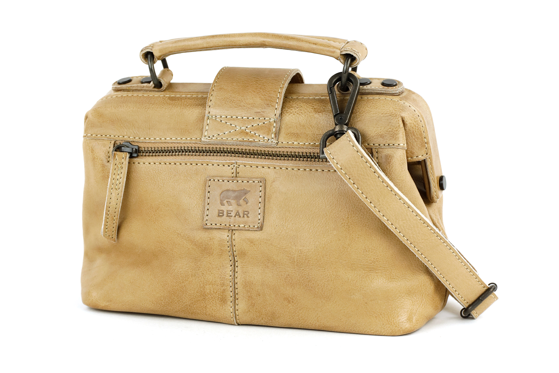 De tas kunt u dragen met het handvat of met de schouderband. De schouderband van de tas is afneembaar en verstelbaar, hierdoor kunt u de schouderband altijd op de gewenste lengte dragen. Het Bear Design logo is mooi verwerkt in het leer. Met deze Bear Design tas heeft u een bijzondere tas. Het formaat van de tas is 23 x 16 x 9.5 cm.