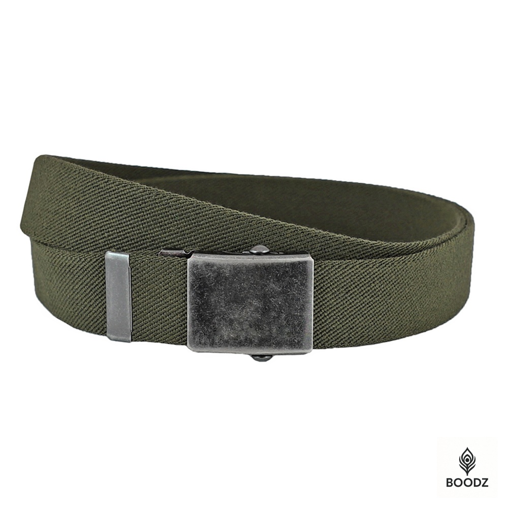 Canvas elastische Boodz riem. De riem is gemaakt van canvas met een lichte elasticiteit, waardoor deze riem een prettig draagcomfort heeft. De riem heeft een breedte van 3.5 cm. De luxe metalen schuifgesp geeft de riem een moderne en nette uitstraling.