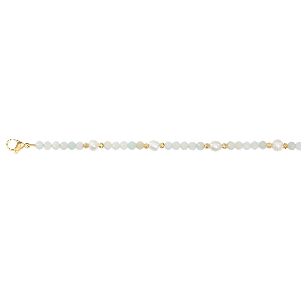 De armband bestaat uit kralen in lichte turquoise tinten, afgewisseld met goudkleurige kralen en verfijnde zoetwaterparels.Deze combinatie geeft je sieradencollectie een frisse, zomerse en speelse uitstraling.