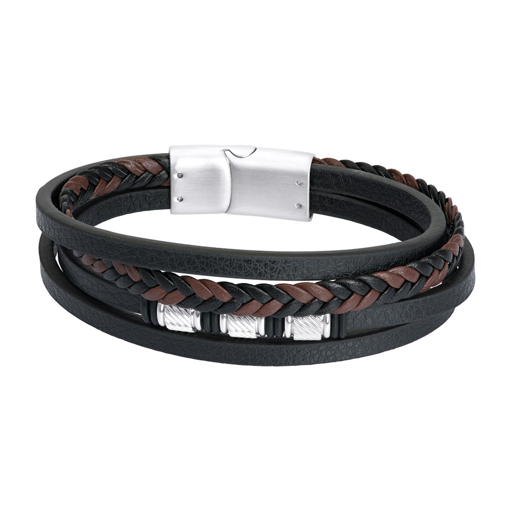 Een derde band heeft een plat gevlochten design van zwart en bruin leder en de vierde band is voorzien van smal, plat zwart leder met mat zilverkleurige stalen details.De bracelet is afgewerkt met een langwerpige, mat zilverkleurige stalen sluiting.
