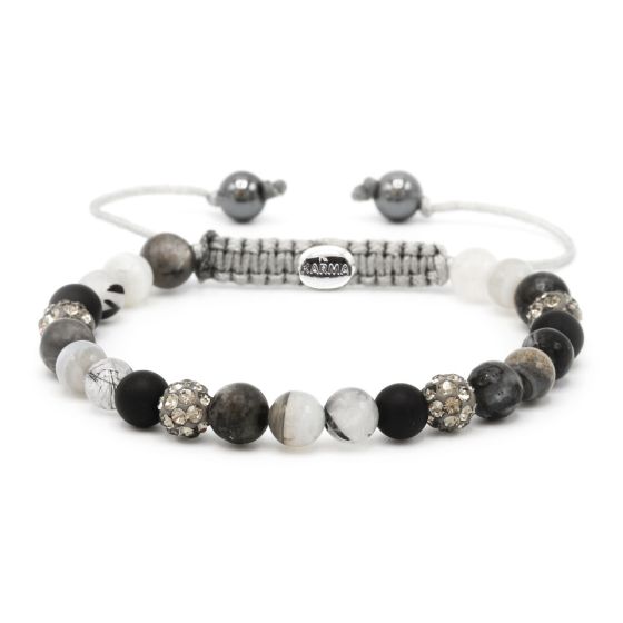Mooie armband van Karma Jewelry. De armband is gemaakt van natuurstenen in combinatie met kristalletjes. De armband is voorzien van stenen in het zwart en grijs. Een aantal steentjes zijn gezet met grijze kristallen.