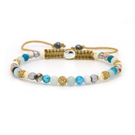 Mooie armband van Karma Jewelry. De armband is gemaakt van natuurstenen in combinatie met kristalletjes. De armband is voorzien van stenen in het wit, blauw en zilver. Een aantal steentjes zijn gezet met gouden kristallen. De stenen zijn 4 mm.