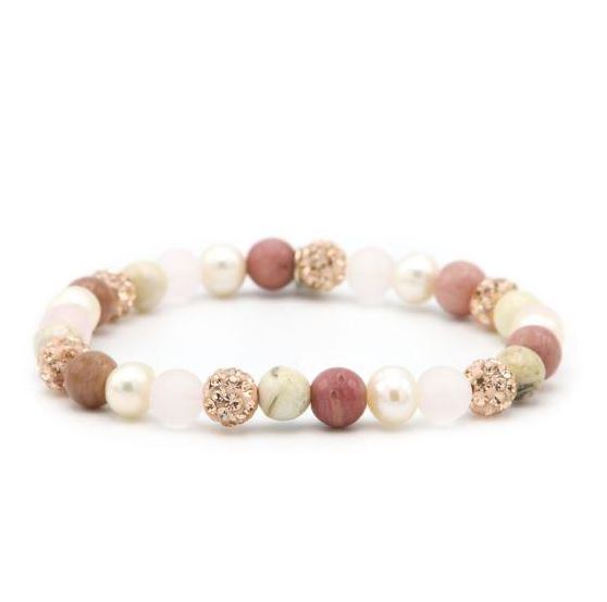 Mooie armband van Karma Jewelry. De armband is gemaakt van natuurstenen in combinatie met kristalletjes. De armband is voorzien parels en meerkleurige stenen in roze en beige. Een aantal steentjes zijn gezet met rosé kristallen. De stenen zijn 6 mm.