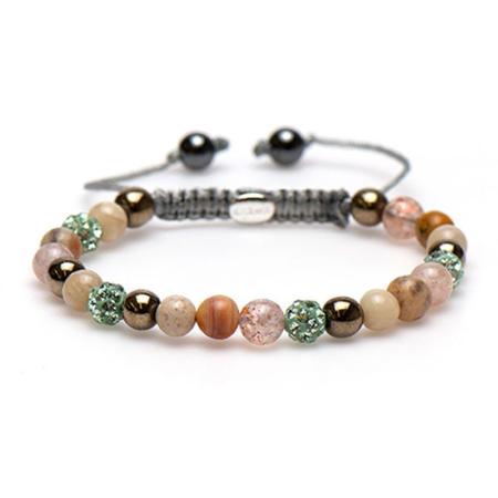 Mooie armband van Karma Jewelry. De armband is gemaakt van natuurstenen in combinatie met kristalletjes. De armband is voorzien van stenen in het roze en goud. Een aantal steentjes zijn gezet met groene kristallen.