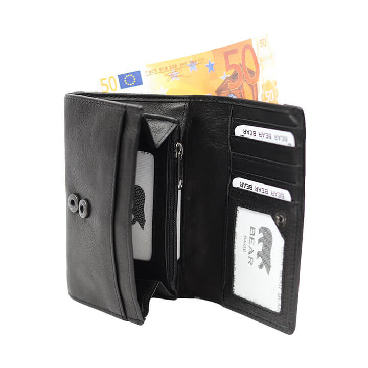 Deze Bear Design portemonnee beschikt over genoeg ruimte voor uw pasjes, muntgeld en briefgeld. Op de voorzijde zit een overslag met drukknoopsluiting. Als u de overslag openklapt vindt u 9 creditcardvakjes waarvan 1 doorzichtig, 2 organisatievakken, 3 steekvakken en een ritsvakje. Ook heeft de portemmonnee op de achterzijde een steekvak en en een vak met ritssluiting, handig voor kleingeld.