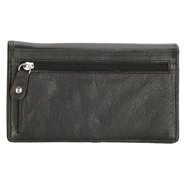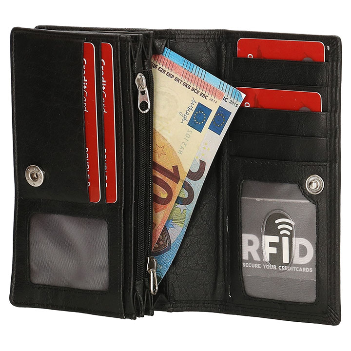 Deze Double-D portemonnee beschikt over genoeg ruimte voor uw pasjes, muntgeld en briefgeld. Op de voorzijde zit een overslag met drukknoopsluiting. Als u de overslag openklapt vindt u 13 creditcardvakjes waarvan 1 doorzichtig, 3 organisatievakken, 4 steekvakken waarvan 2 doorzichtig en 2 ritsvakjes. Ook heeft de portemonnee op de achterzijde een ritsvak en steekvak. De afmeting van de portemonnee is 15.5 x 8.5 x 3 cm.