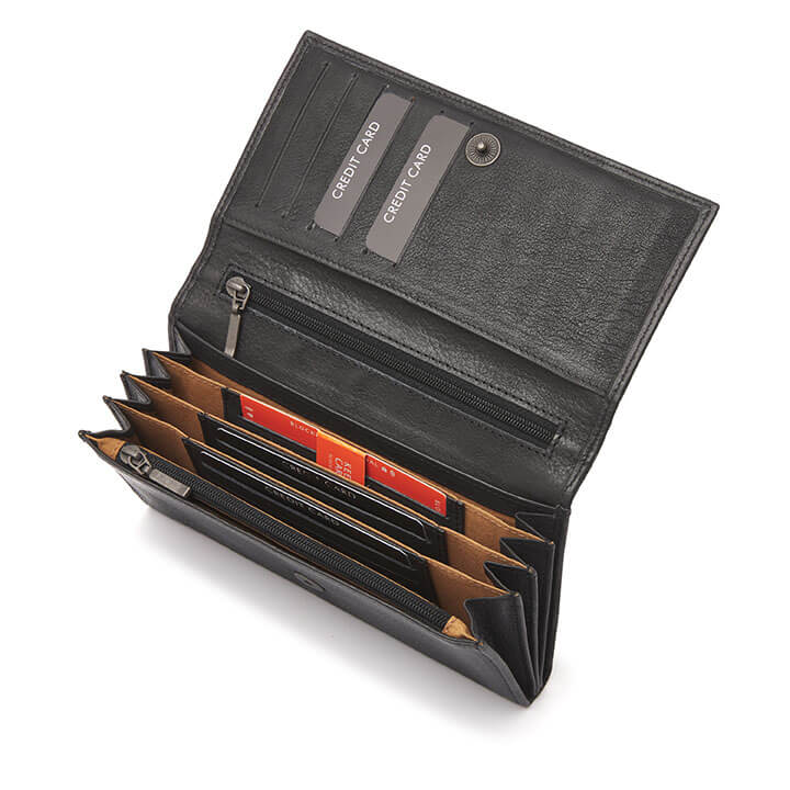 De portemonnee beschikt onder de overslag met drukknoopsluiting over 12 creditcardvakjes, 7 steekvakken, 4 organisatievakken en 2 binnenvakjes met ritssluiting. Ook heeft de portemonnee een achtervak met ritssluiting. De portemonnee heeft RFID protectie, door de RFID protectie kunnen uw pasjes niet uitgelezen worden. Dit is tegenwoordig onmisbaar nu contactloos betalen een belangrijk onderdeel is van onze betaalmethode. De afmeting van de portemonnee is 17 x 10 x 3 cm.