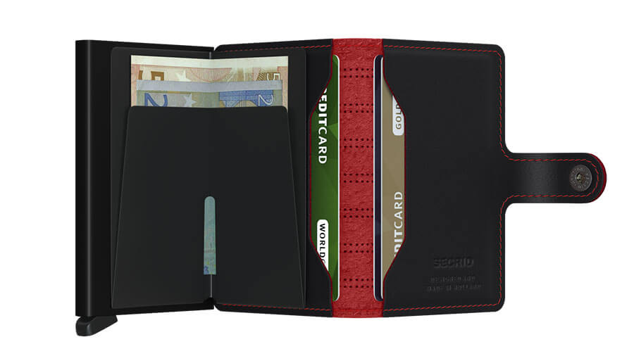 De Secrid Mini wallet is klein maar met veel ruimte voor uw geld en uw pasjes. De Mini wallet beschikt over de Cardprotector van Secrid met een lederen hoes eromheen en een drukknoop.