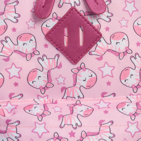 Gave rugzak van het merk Bestway. Op de tas zit een roze zebraprint. De tas heeft een ruim hoofdcompartiment met ritssluiting, ook heeft de tas een voorvak met ritssluiting. In het hoofdvak zit een steekvak. Je kunt de tas dragen met de 2 verstelbare schouderbanden of met het handvat. Doordat de schouderbanden verstelbaar zijn kan je de tas altijd op de gewenste lengte dragen. De rug en de schouderbanden zijn gewatteerd, hierdoor draagt de tas zeer comfortabel. De afmeting van de tas is 22 x 29 x 13 cm.
