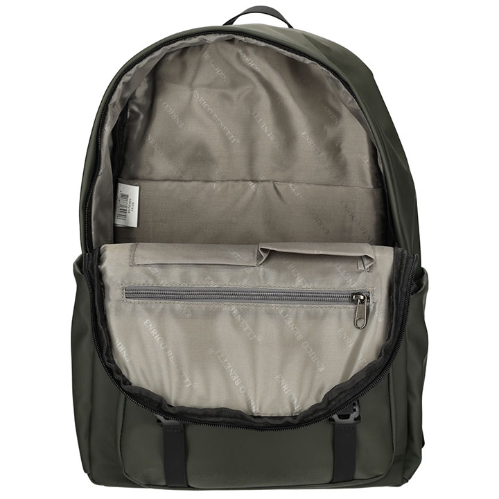 Stoere waterproof rugzak uit de Glasgow serie van Enrico Benetti. De tas is gemaakt van waterproof PU materiaal wat de tas waterbestendig maakt. De rugzak beschikt over een zeer ruim hoofdvak met ritssluiting. In het hoofdvak zit een laptopvak geschikt voor 15 inch laptops, 2 steevakken en een binnenvak met ritssluiting. Op de voorzijde van de tas zit ook nog een ritsvak en een vak met klipsluitingen. Ook heeft de rugzak 2 zijvakken, handig voor een flesje.