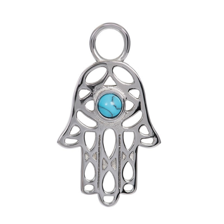 Leuke iXXXi charm in de vorm van een gelukshandje/Hamsa handje. Op het handje zit een turquoise steenje. De charm is gemaakt van edelstaal. De hanger kun je los aan een ketting hangen of combineren met een andere iXXXi charm. Het betreft hier alleen de charm, de ketting is los bij te bestellen.