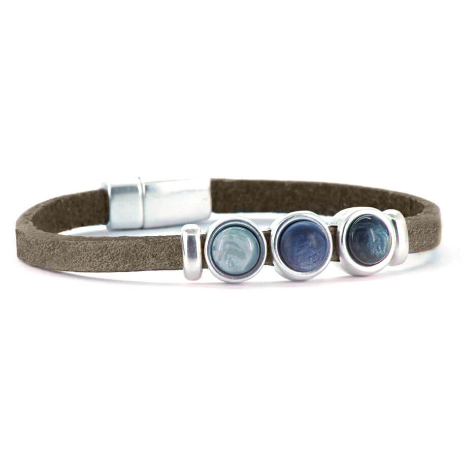 Prachtige armband van Qoss. De armband is gemaakt in een mooie combinatie van hoogwaardig en nikkelvrij edelstaal met echt leer. Het leer van de armband is taupe en op de armband zitten 3 mooie stenen in blauw tinten. De armband is daarnaast voorzien van 2 zilverkleurige schuivers, dit geeft de armband een leuk effect. Het leer van de armband heeft een breedte van 5 mm en de stenen hebben een diameter van 7 mm. De armband sluit met een magneetsluiting. De armband is geschikt voor een polsmaat van ongeveer 17 cm.