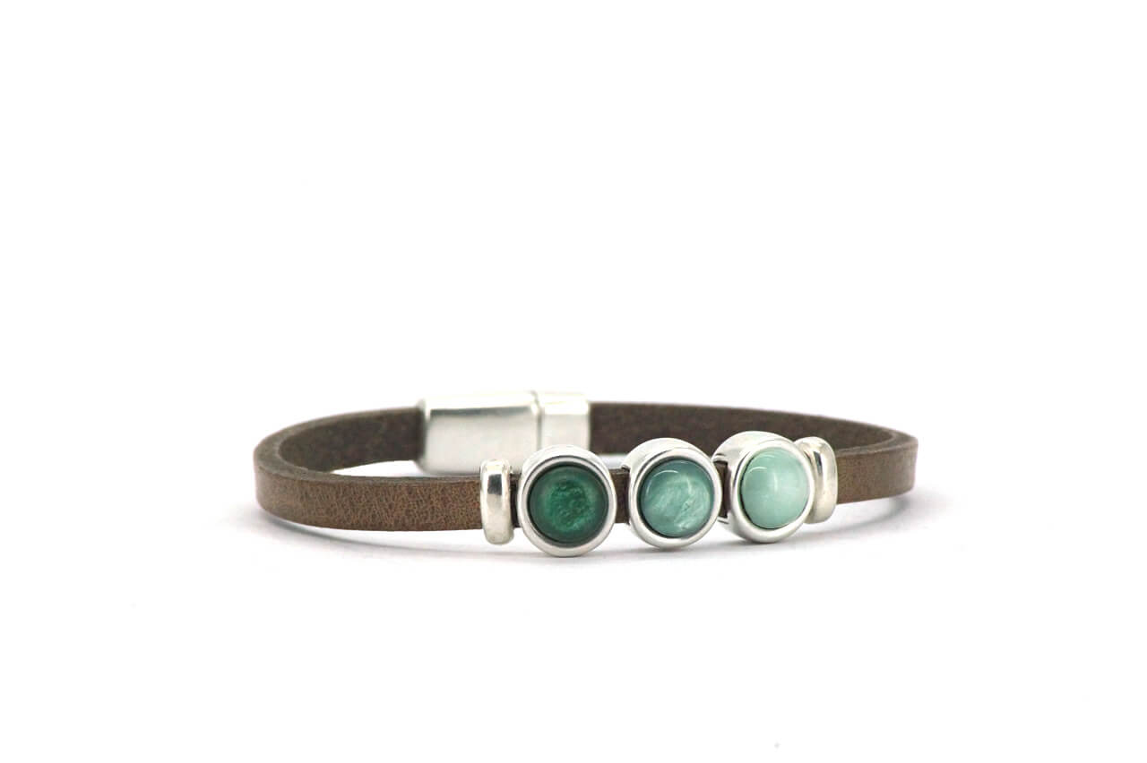 Prachtige armband van Qoss. De armband is gemaakt in een mooie combinatie van hoogwaardig en nikkelvrij edelstaal met echt leer. Het leer van de armband is taupe en op de armband zitten 3 mooie stenen in groentinten. De armband is daarnaast voorzien van 2 zilverkleurige schuivers, dit geeft de armband een leuk effect. Het leer van de armband heeft een breedte van 5 mm en de stenen hebben een diameter van 7 mm. De armband sluit met een magneetsluiting. De armband is geschikt voor een polsmaat van ongeveer 18 cm.