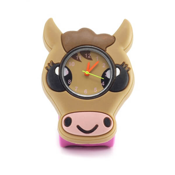 Leuk kinderhorloge met paard. Het horloge is gemaakt van kunststof. Het horloge kan gemakkelijk om de pols gedaan worden door het horloge zachtjes tegen de pols aan te slaan. Het horloge past om elke pols. Doordat het horloge is gemaakt van licht materiaal draagt het zeer prettig, bovendien komt er geen metaal direct op de huid. Het klokje heeft een duidelijke wijzerplaat en de batterijen zijn gemakkelijk te verwisselen. Verkrijgbaar in verschillende uitvoeringen.