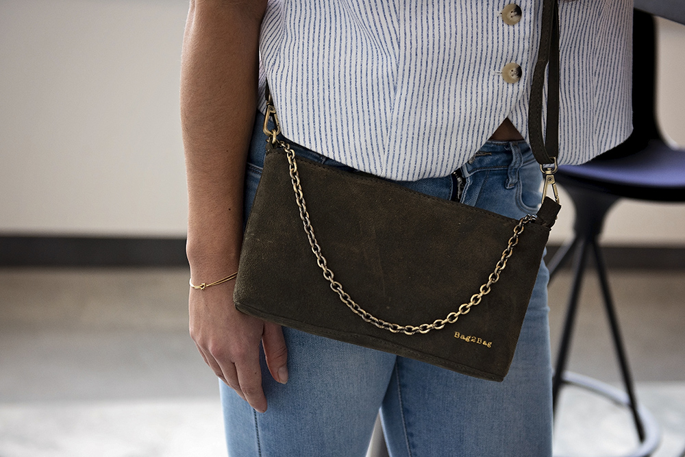 - Bag2Bag logo stijlvol verwerkt in het suède