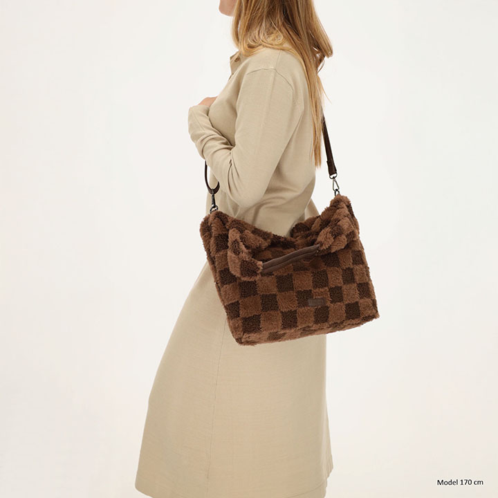 fluffy teddy materiaal met een opvallend blokjespatroon, waardoor de tas zowel trendy als stijlvol oogt.