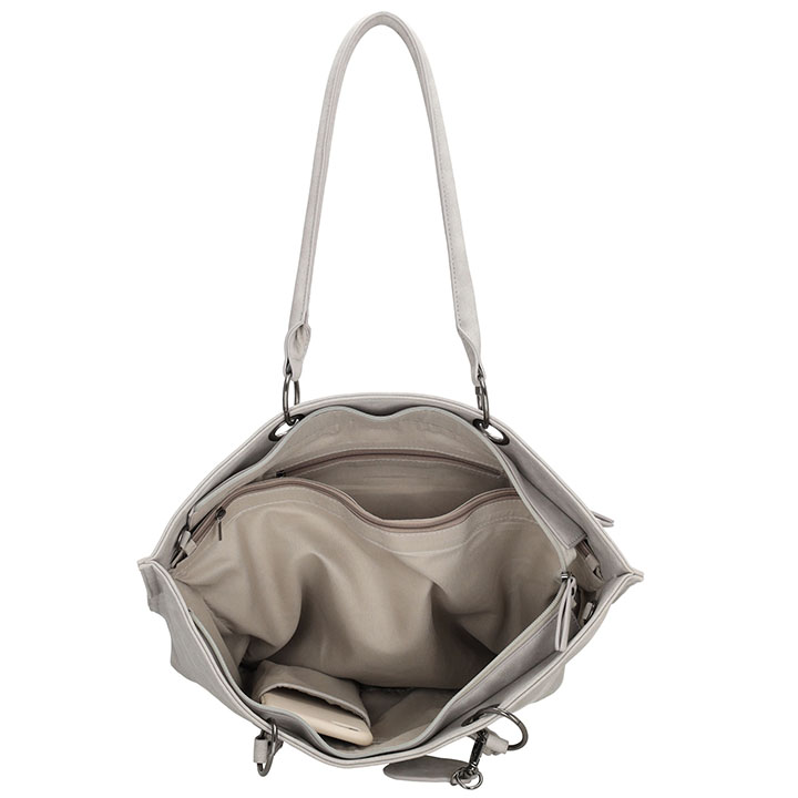 Op de bovenzijde heeft de tas een ruim hoofdvak met ritssluiting, intern heeft de tas een verdeler met ritssluiting, een steekvak, ritsvak en een telefoonvak. Ook heeft de tas een achtervak met ritssluiting. Door de meerdere vakken kunt u uw spullen goed gescheiden houden. De afmetingen van de tas zijn 45 x 30 x 13 cm.