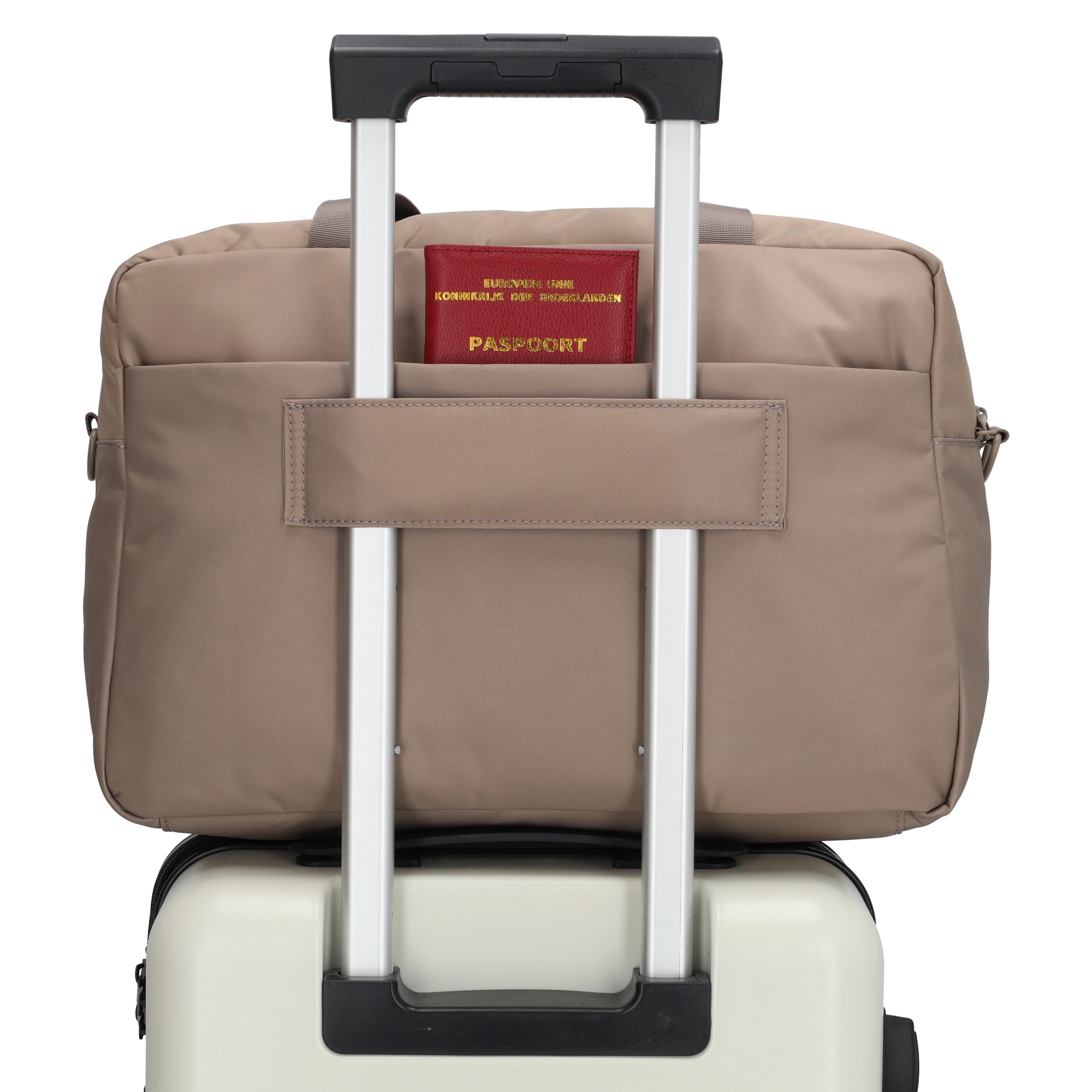 Daarnaast heeft de tas twee voorvakken en een achtervak met ritssluiting voor items die je snel bij de hand wilt hebben.Dankzij de band aan de achterzijde schuif je de tas eenvoudig over het handvat van je koffer, ideaal voor tijdens het reizen.