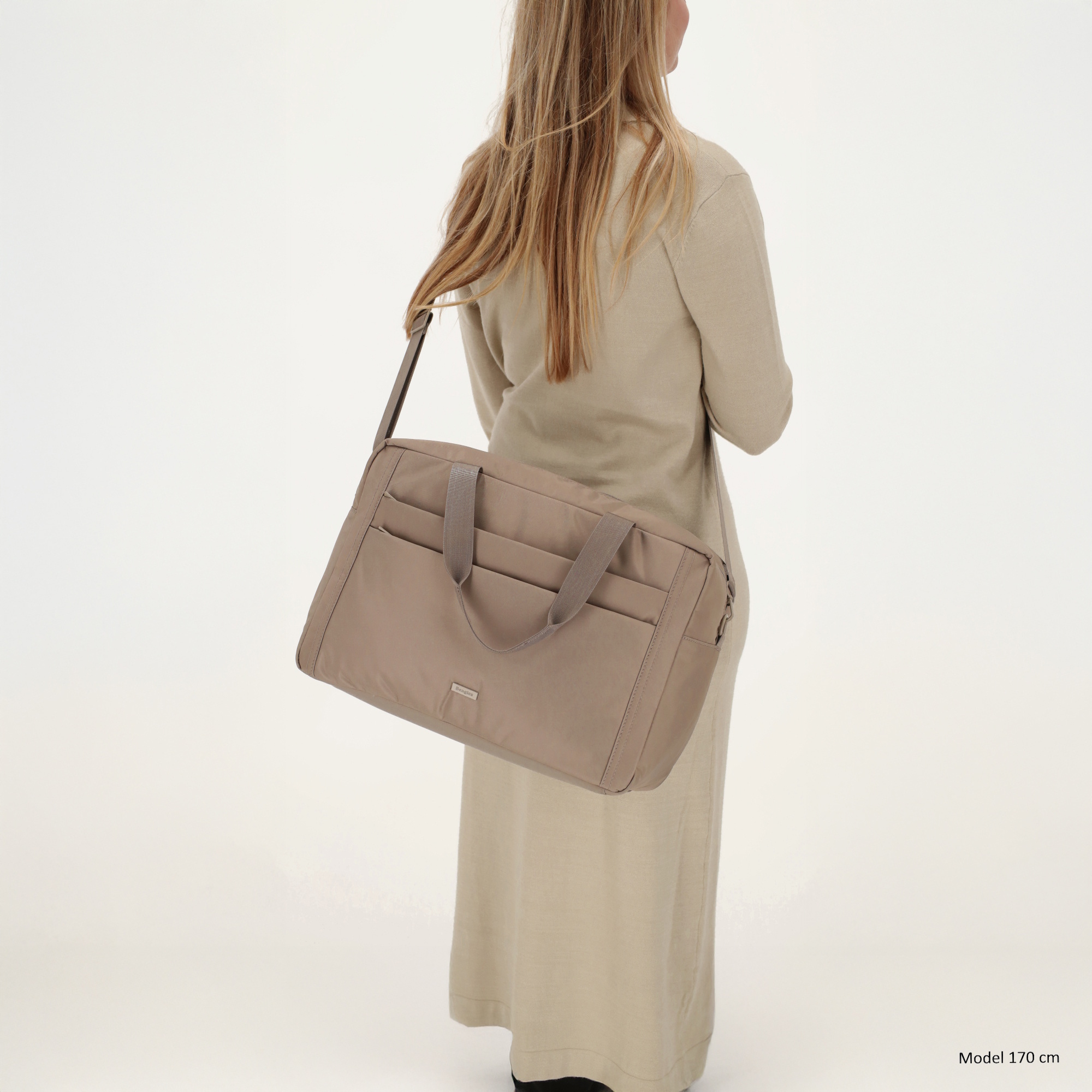 Je kunt de tas dragen met de twee stevige handvaten of met de lange verstelbare en afneembare schouderband.