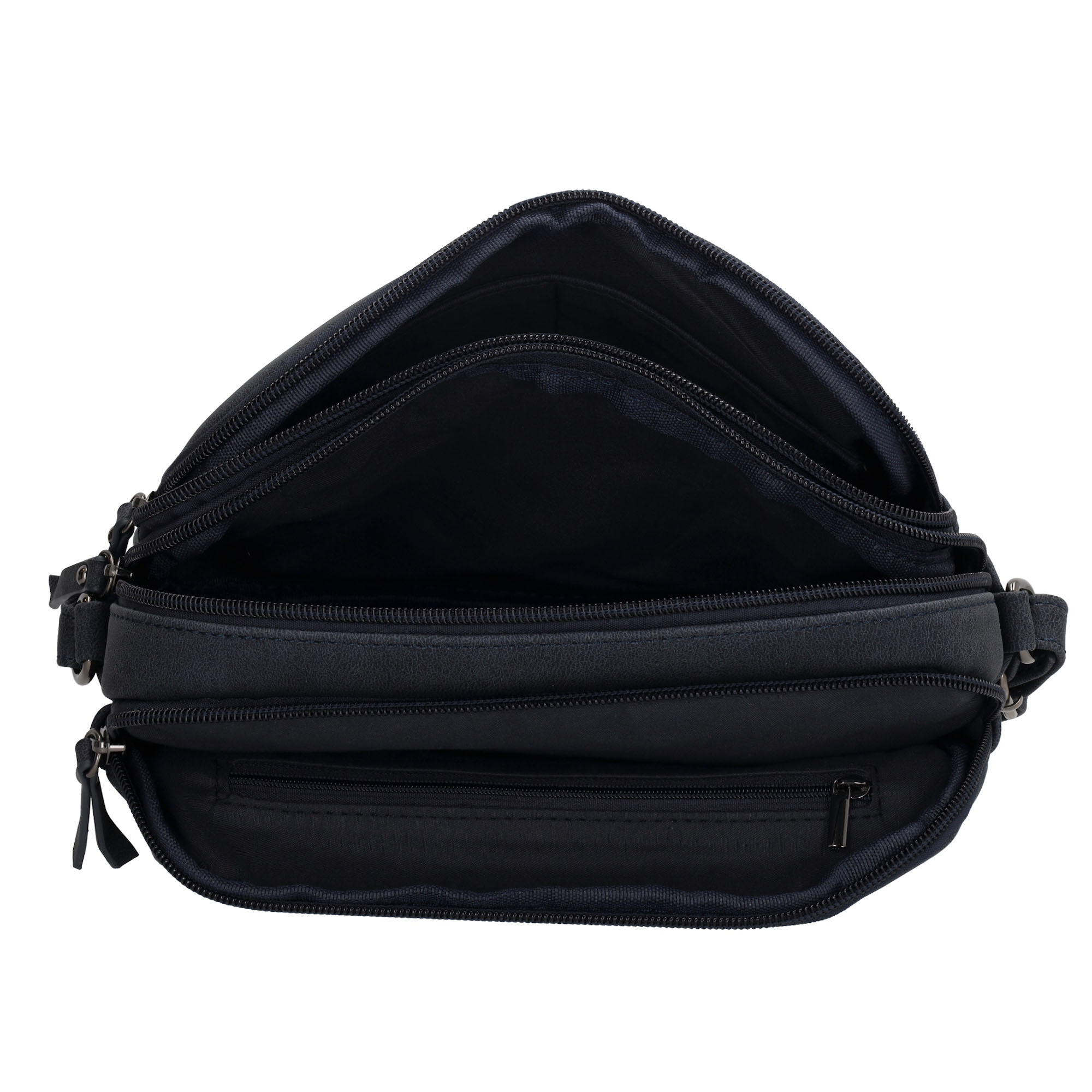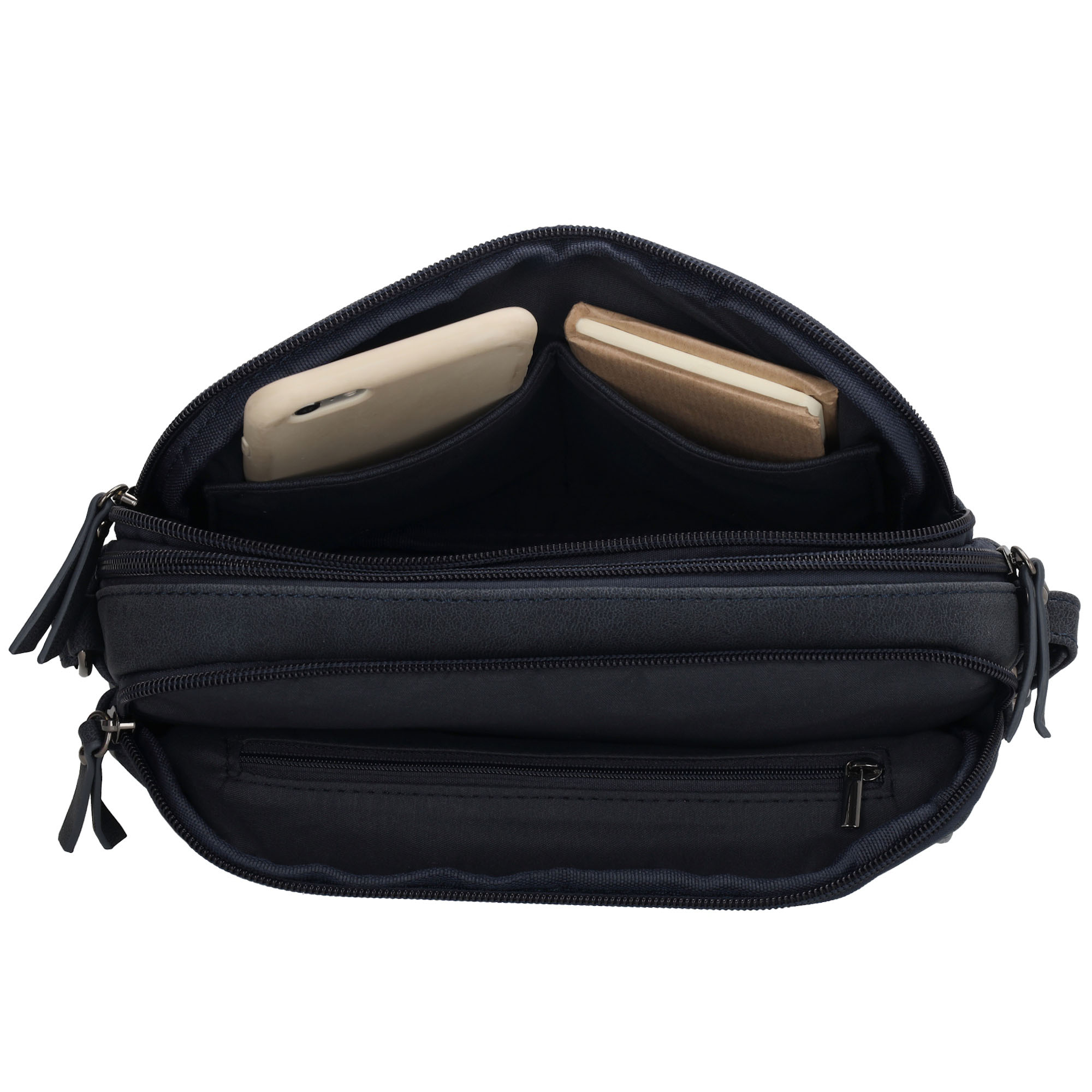 De tas heeft onder de overslag met magneetsluiting 3 hoofdvakken met ritssluiting, intern heeft de tas een binnenvak met ritssluiting en 2 steekvakjes. Ook heeft de tas een voorvak en achtervak met ritssluiting. De afmetingen van de tas zijn 25 x 18 x 8 cm.