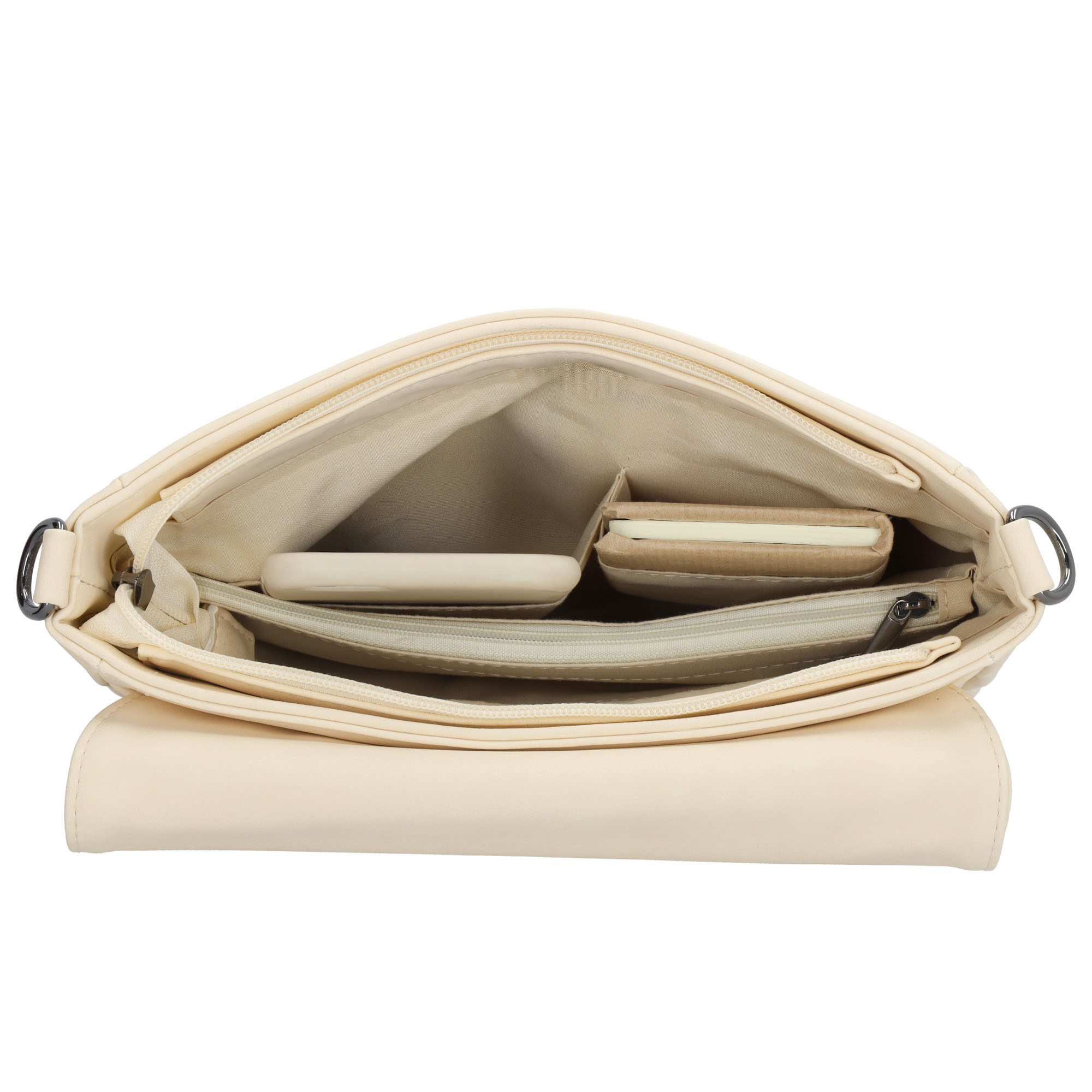 De tas heeft onder de overslag met maagneetsluiting het hoofdvak met ritssluiting, intern heeft de tas een binnenvak met ritssluiting, 2 steekvakjes en verdeler met ritssluiting. Ook heeft de tas een achtervak met ritssluiting. De afmetingen van de tas zijn 27 x 17.5 x 7 cm.