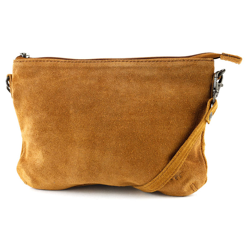 Veelzijdige suède schoudertas van Bear Design met royaal hoofdvak, achtervak en afneembare banden. Te dragen als clutch, schoudertas of crossbody.