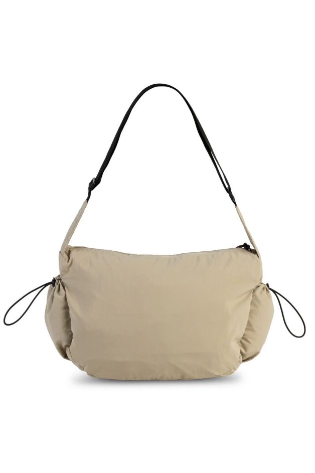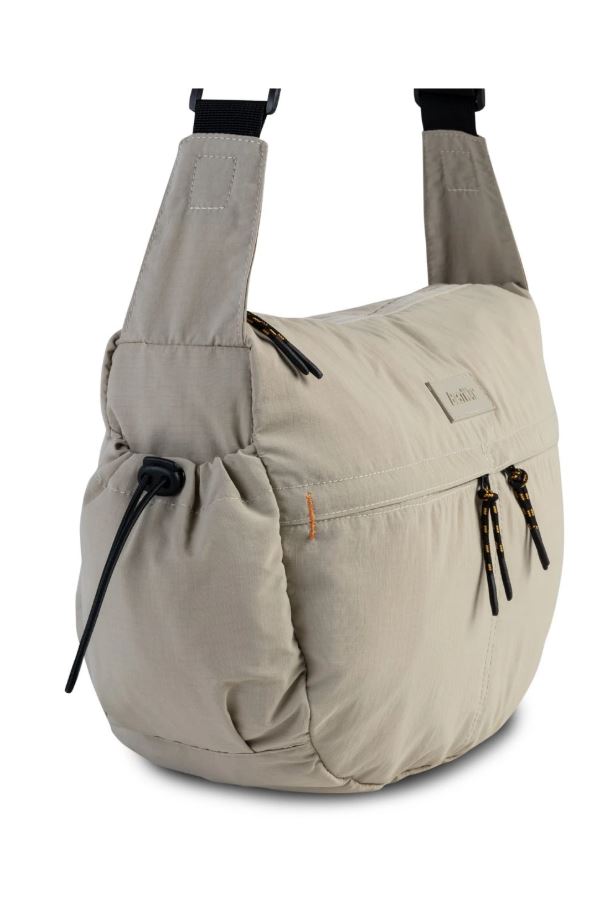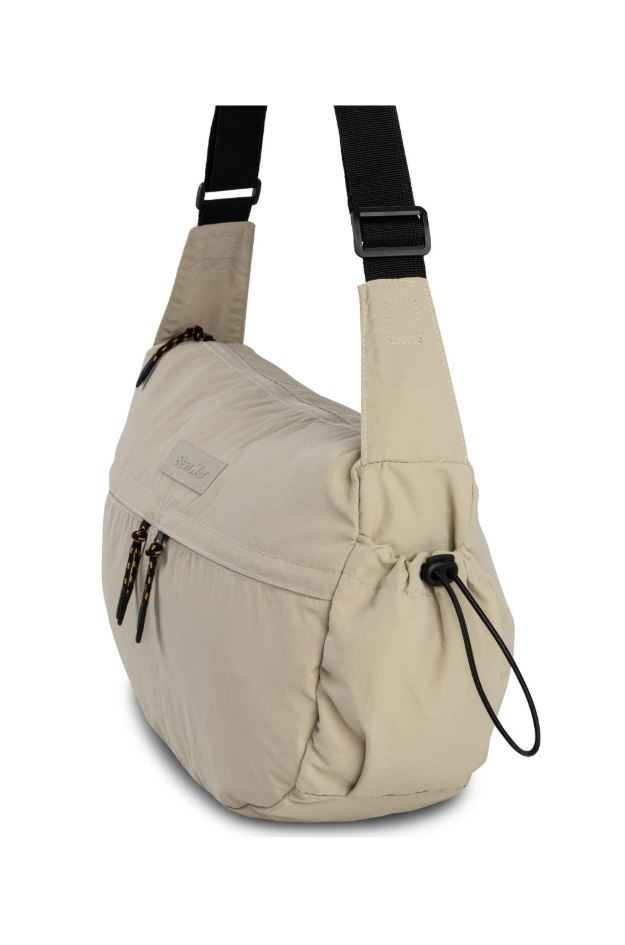 Aan de buitenkant bevinden zich twee zijvakken met trekkoord en twee voorvakken met ritssluiting voor snelle toegang tot belangrijke spullen.Dankzij de verstelbare schouderband draag je de tas comfortabel op jouw manier.
