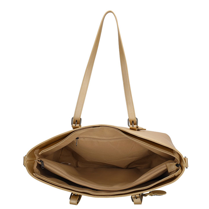 De tas beschikt over een ruim hoofdvak en achtervak met ritssluiting. Intern heeft de tas een smartphonevakje, een binnenvak met ritssluiting en een gewatteerd laptopvak 15.6” met ritssluiting. De tas heeft 2 handvatten en een lange schouderband, hierdoor kunt u de tas dragen als handtas en als schoudertas. De schouderband is afneembaar en verstelbaar, hierdoor kunt u de tas ook altijd op de gewenste lengte dragen. De tas is 44 x 31 x 14 cm.