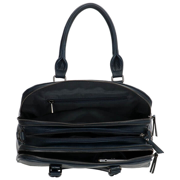 De tas beschikt op de bovenzijde 3 ruime vakken met ritssluiting. Intern heeft de tas een steekvak, een smartphonevakje en een binnenvak met ritssluiting. Ook heeft de tas een achtervak met ritssluiting. De tas heeft 2 handvatten en een lange schouderband, hierdoor kunt u de tas dragen als handtas en als schoudertas. De schouderband is afneembaar en verstelbaar, hierdoor kunt u de tas ook altijd op de gewenste lengte dragen. De tas is 32 x 22 x 12 cm.
