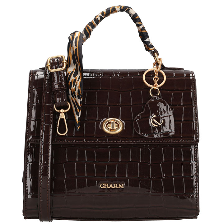 Charm London Knightsbridge handtas met croco laklook, overslag en kliksluiting. Elegant en compact design met hartvormige sleutelhanger, spiegel en decoratief sjaaltje.