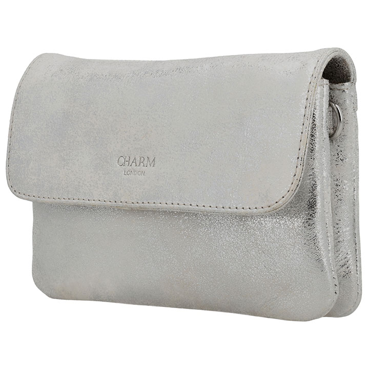 Elegante crossbodytas van Charm London in metallic leer met overslag, polsbandje en afneembare schouderband. Stijlvol, compact en veelzijdig te dragen.