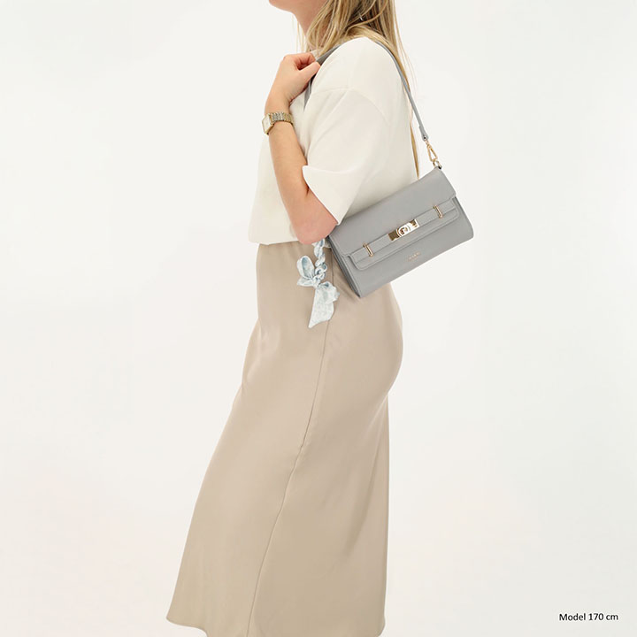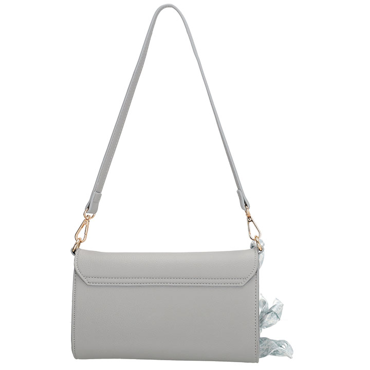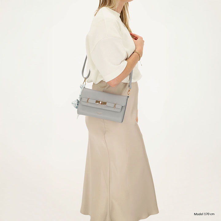 Een speels detail is het afneembare sjaaltje aan de tas, dat zorgt voor een elegante en vrouwelijke touch.