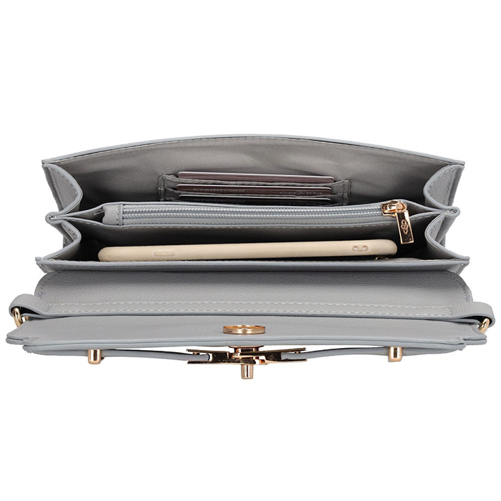 Aan de binnenzijde is de tas verrassend praktisch ingedeeld met 2 ritsvakken, 2 steekvakken en 3 pasjesvakjes.