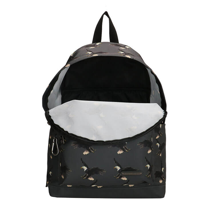 Rugzak uit de Nairobi serie van Enrico Benetti. Deze Enrico Benetti rugzak is met zijn ruime compartimenten een praktische maar ook leuke rugtas. Op de rugzak zit een print met adelaars. U kunt al uw spullen goed opbergen in het ruime hoofdvak en voorvak met ritssluiting van de tas. Intern heeft de tas een 14'' gewatteerd laptopvak en een binnenvak met ritssluiting. Met deze handige vakindeling is het gemakkelijk om uw spullen gescheiden te houden. Door de gewatteerde riemen en rugzijde draagt de rugzak zeer comfortabel. De schouderbanden zijn verstelbaar. Op de bovenzijde van de rugzak zit een handvat.