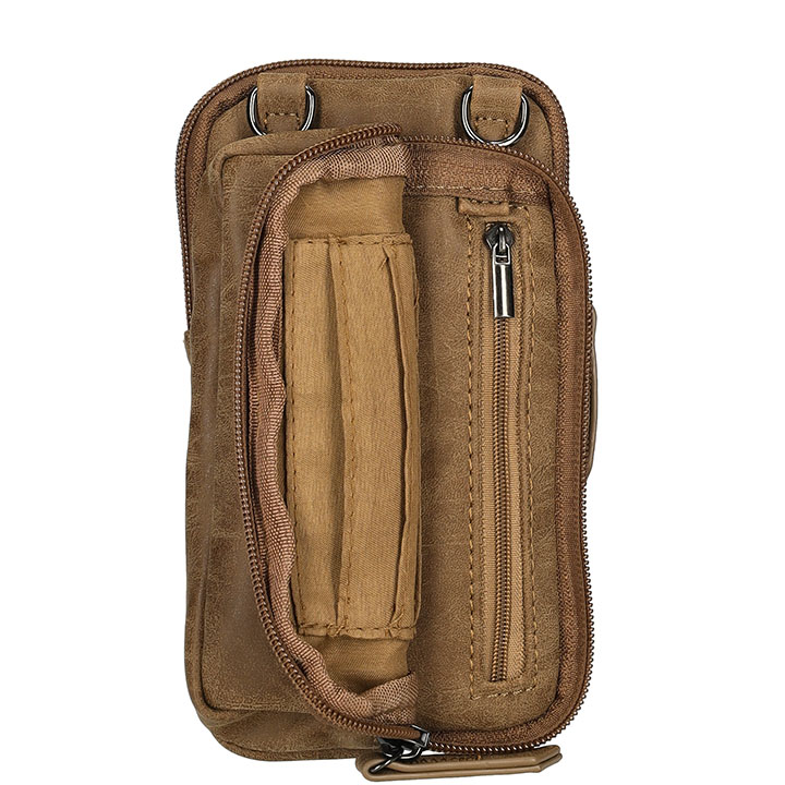 Het tasje heeft een hoofdvak en voorvak met ritssluiting. Intern heeft het tasje zitten 3 creditcardvakjes en een binnenvak met ritssluiting. Door deze goede vakindeling kunt u gemakkelijk al uw spullen gescheiden houden. De afmeting van de tas is 10 x 18 x 3 cm.