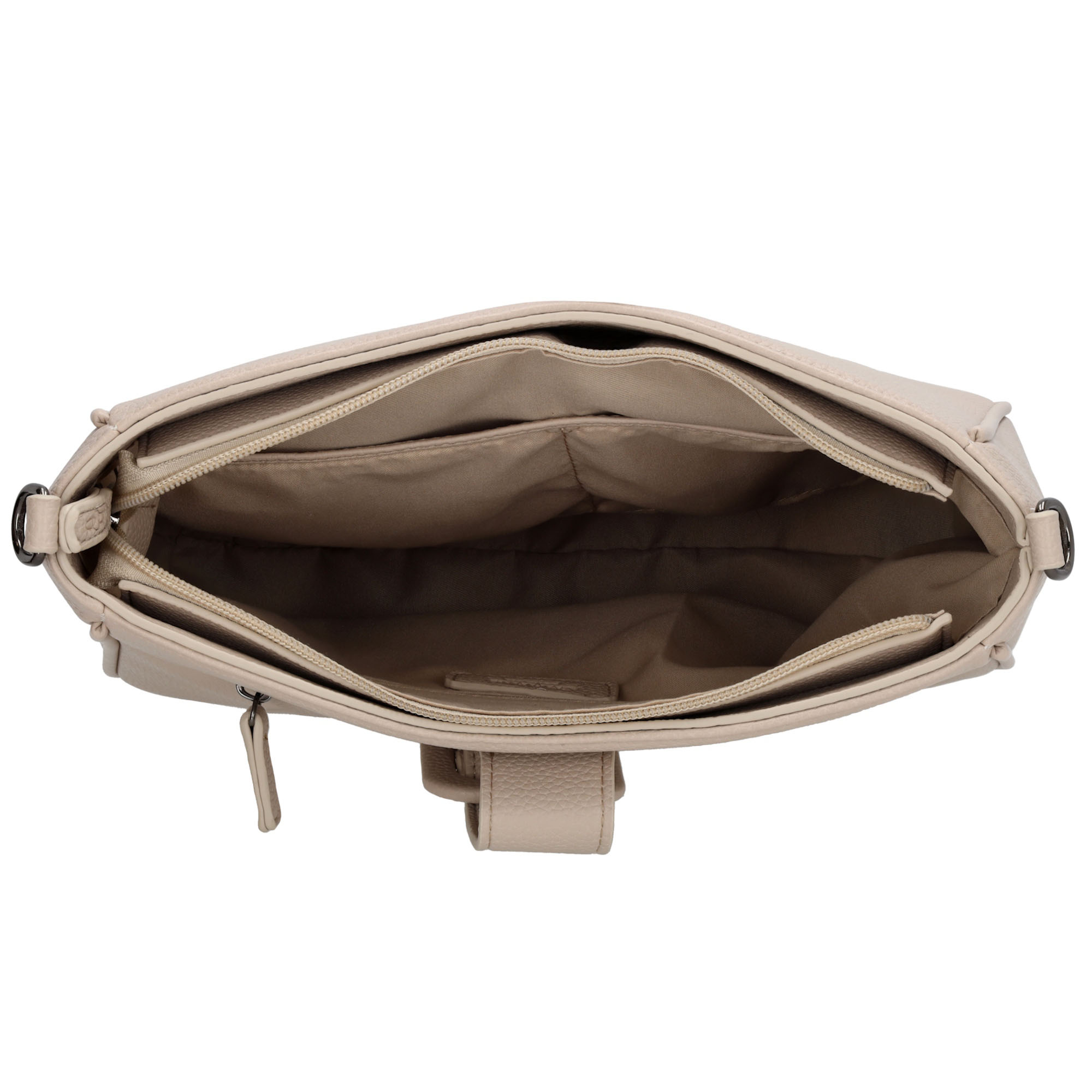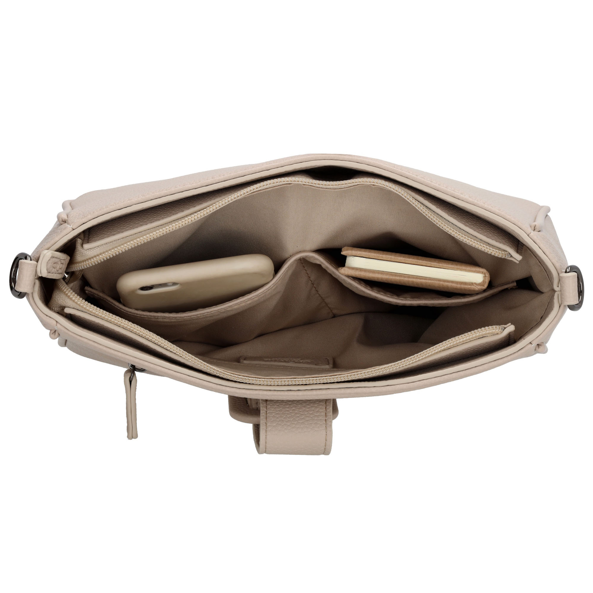 Binnenin beschikt de tas over een ritsvak en twee insteekvakken, waardoor je je essentials overzichtelijk kunt opbergen.