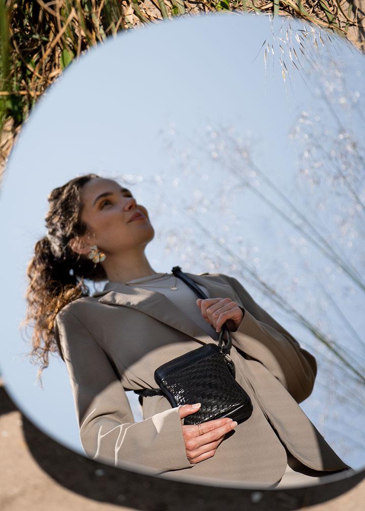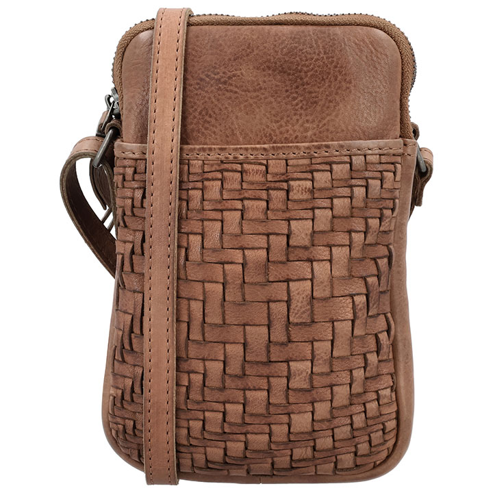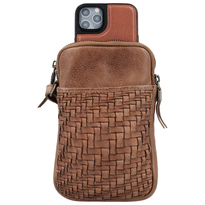 Gemaakt van soepel leer en afgewerkt met een handgeweven voorkant, combineert dit model functionaliteit met een verfijnd design.Het tasje beschikt over twee hoofdvakken met ritssluiting en een voorvak, waardoor je je telefoon en kleine essentials overzichtelijk en veilig kunt opbergen.