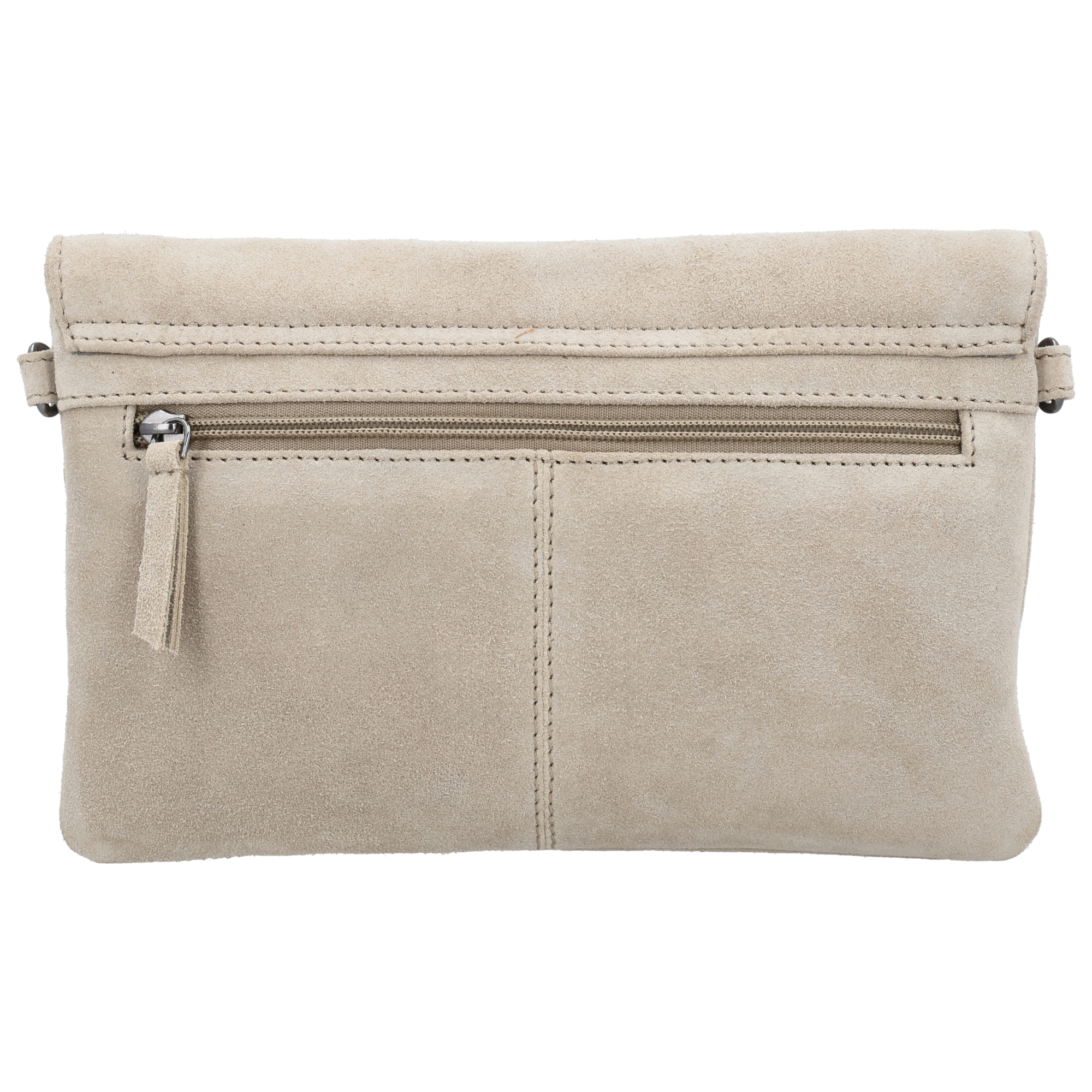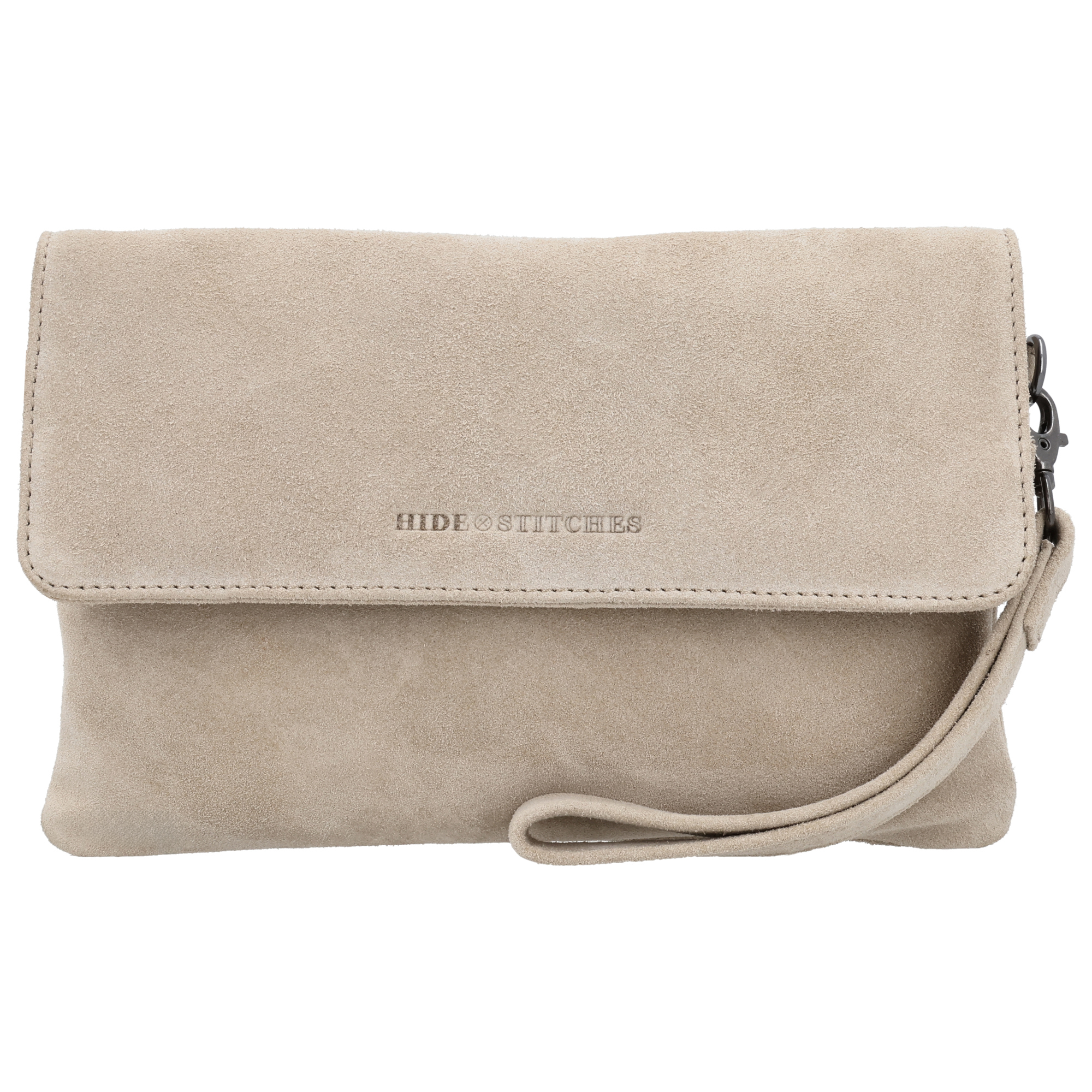 Stijlvolle suède clutch/schoudertas uit de Hide & Stitches Brazos serie. Met rits- en overslagsluiting, achterritsvak, verstelbare crossbodyband en afneembaar polsbandje. Formaat 24,5 × 14,5 × 2,5 cm.