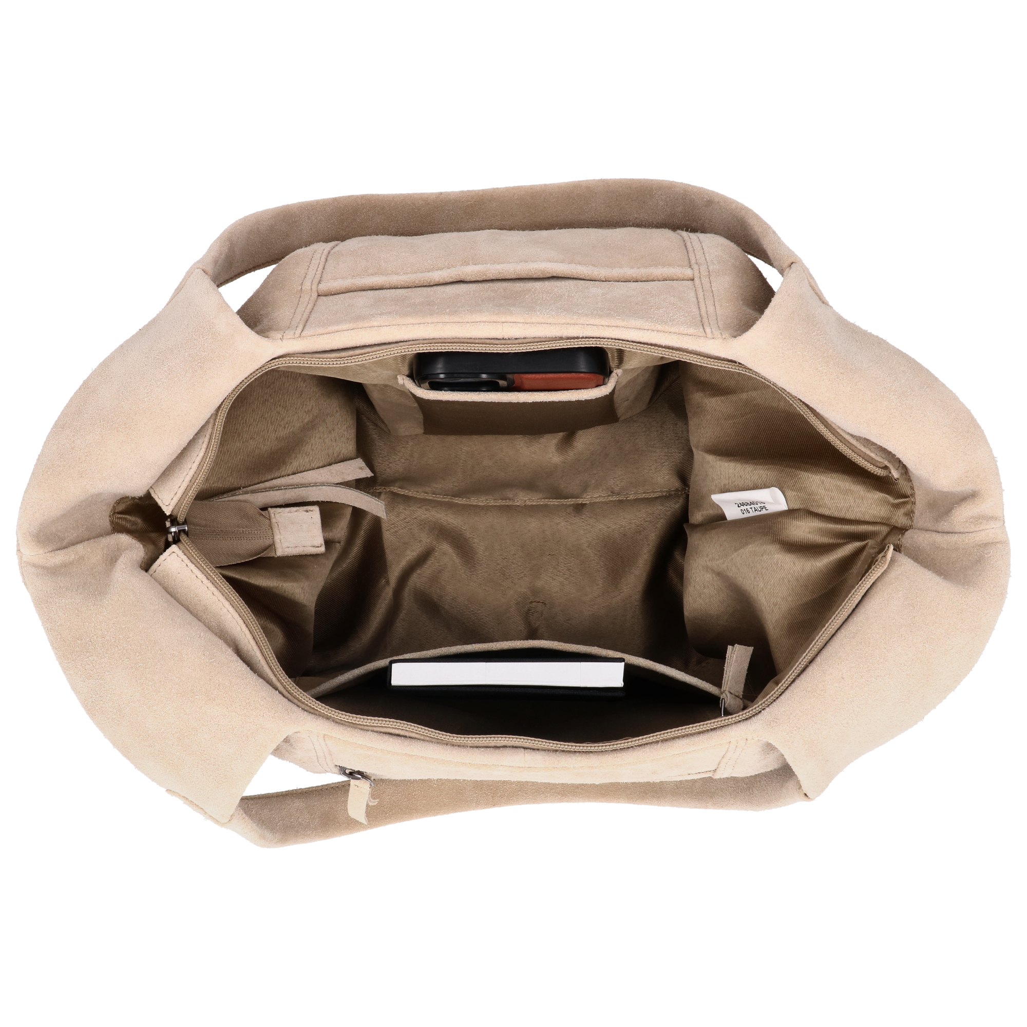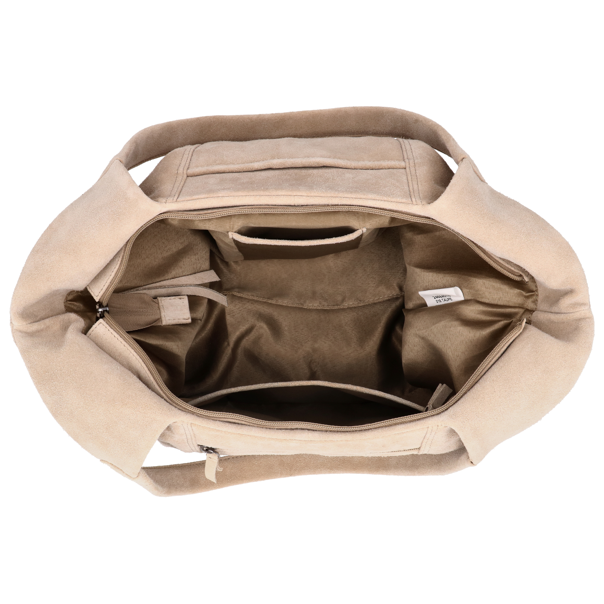 Stijlvolle suède handtas/shopper van Hide & Stitches. Met hoofdvak met rits, binnenvakjes, voorvak met magneetsluiting en achterritsvak. Formaat 47 × 27 × 15 cm – ideaal voor dagelijks gebruik.