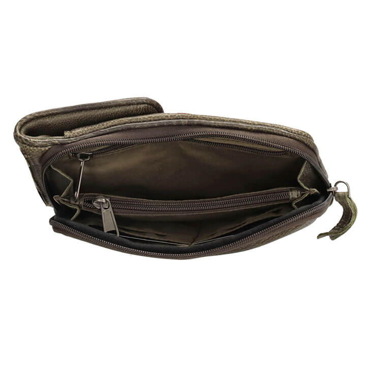 Op de voorzijde heeft de tas een vak (21 x 11 cm) met magneetsluiting geschikt voor een telefoon. Ook heeft de tas een zip around vak met daarin 6 creditcardvakjes, 2 steekvakken en 2 binnenvakjes met ritssluiting. Door deze handige vakindeling is de tas ideaal in gebruik. De afmetingen van de tas zijn 11 x 21 x 4 cm.