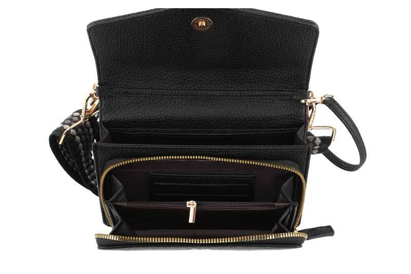 De tas heeft onder de overslag een vak met ritssluiting en een steekvak, intern heeft de tas 6 creditcardvakjes en 2 kleine steekvakjes. Ook heeft de tas een voorvak met magneetsluiting en een achtervak met ritssluiting. De afmetingen van de tas zijn 20 x 12.5 x 7 cm.