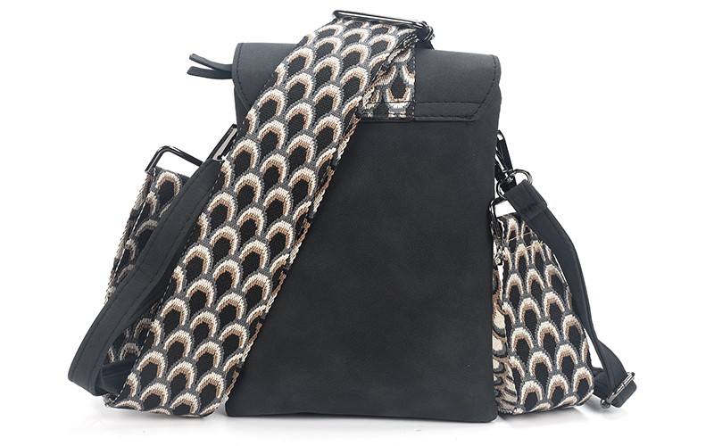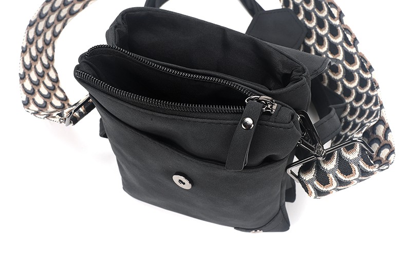 De tas heeft onder de overslag met magneetsluiting een ritsvak en 3 steekvakken. De afmeting van de tas is 14.5 x 19 x 4 cm.