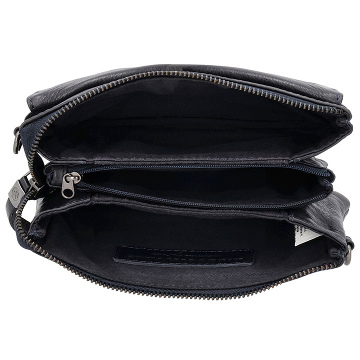 De tas heeft op de bovenzijde een ruim vak met ritssluiting. Intern heeft de tas een binnenvakje met ritssluiting, 4 steekvakken en 6 creditcardvakjes. Op de voorzijde zit een vak met overslag die sluit met een magneetsluiting. Het Hide & Stitches logo is mooi verwerkt in het leer. De afmeting van de tas is 21 x 12 x 4 cm.