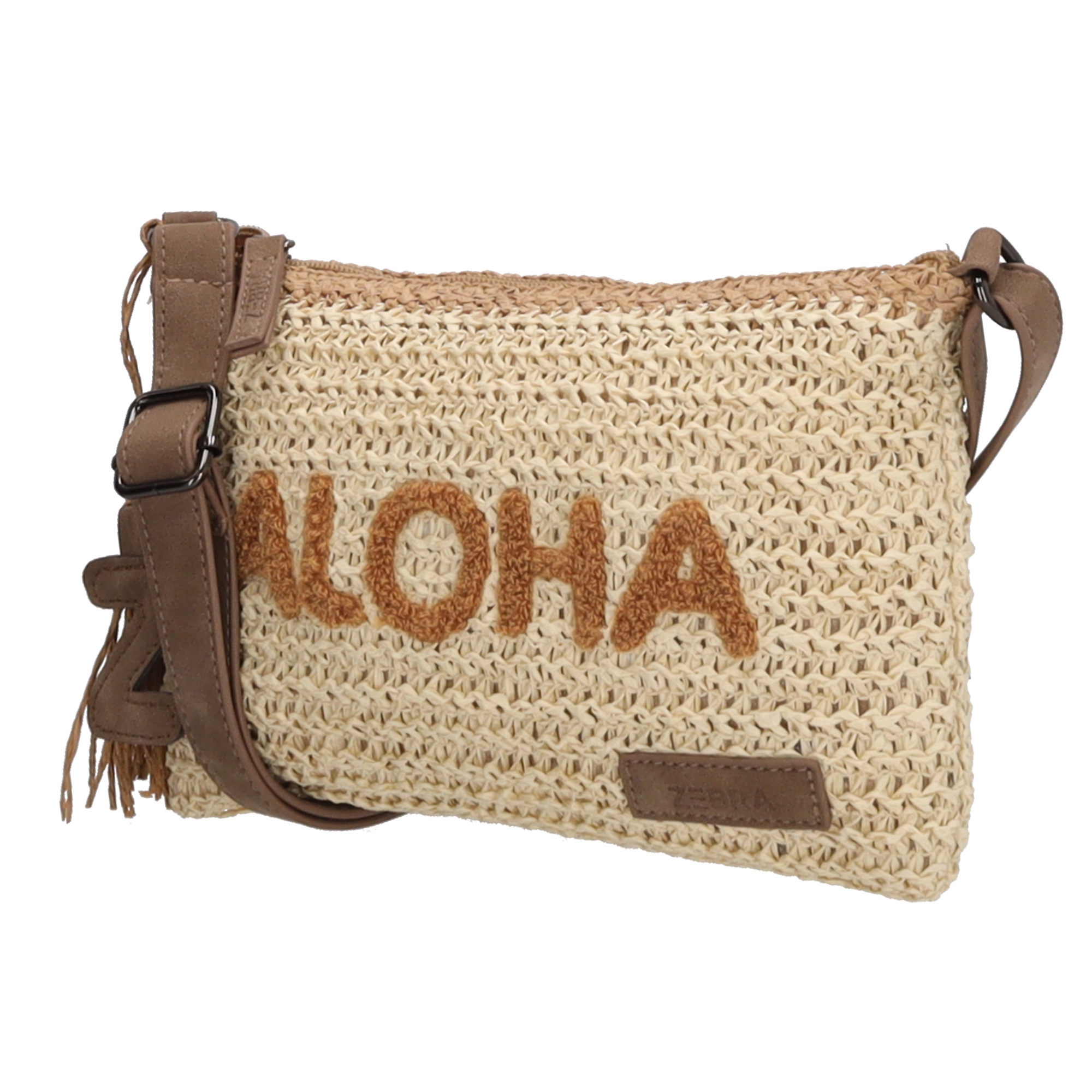Aan de voorkant zijn de aloha letters verwerkt, wat zorgt voor een vrolijk en opvallend detail.De tas is afgewerkt met een bag charm met kwast en een Z, wat het geheel een herkenbare en speelse finishing touch geeft.
