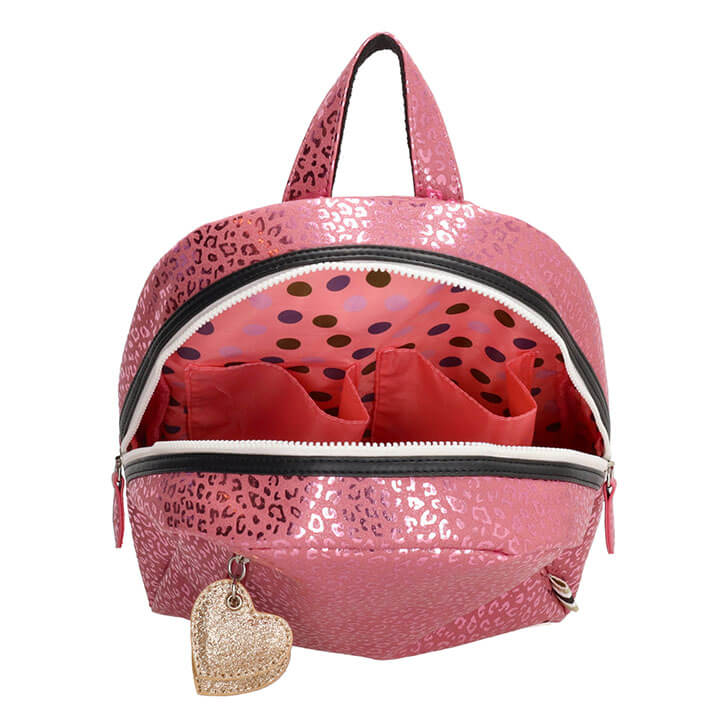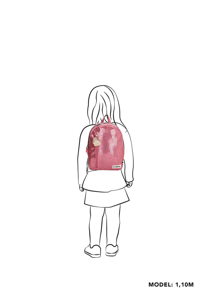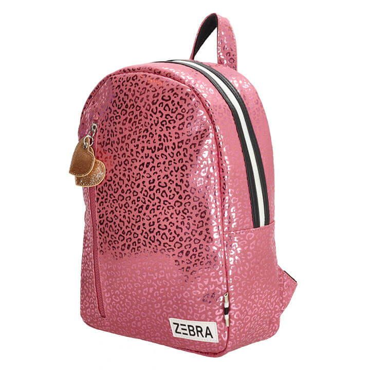 Leuke rugzak van Zebra Trends. Op de voor- en achterzijde van de rugzak zit een roze metallic leopard print. Aan de tas zit een Zebra sleutelhanger. De tas heeft een ruim hoofdvak met ritssluiting op de bovenzijde, ook heeft de tas een voorvak met ritssluiting. In het hoofdvak zitten 2 steekvakken. Op de achterzijde zit een doorzichtig steekvakje voor een naamlabel.